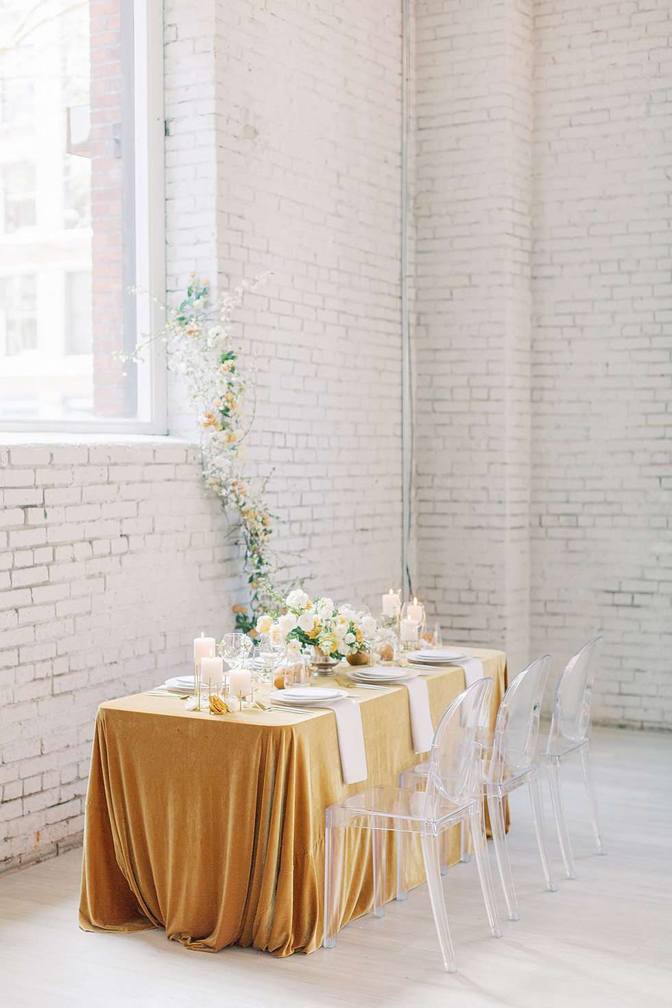 We knew we needed a luxurious linen that fit the color scheme perfectly and found just that from Party Crush Studio. The velvet mustard linen is perfect against the white brick backdrop of The 101, a killer space in historic Pioneer Square in Seattle, Washington. The tabletop rentals from CORT Party Rental stand out against the bold linen and the stunning tabletop florals from Leah Erickson Floral tie everything together. You can even peep some Bosc pears of the table to represent the inspiration behind the shoot. The organic floral arrangement style of the centerpiece gives the table the perfect amount of whimsy and the delicate florals on the wall installation behind the table add that perfect little touch.