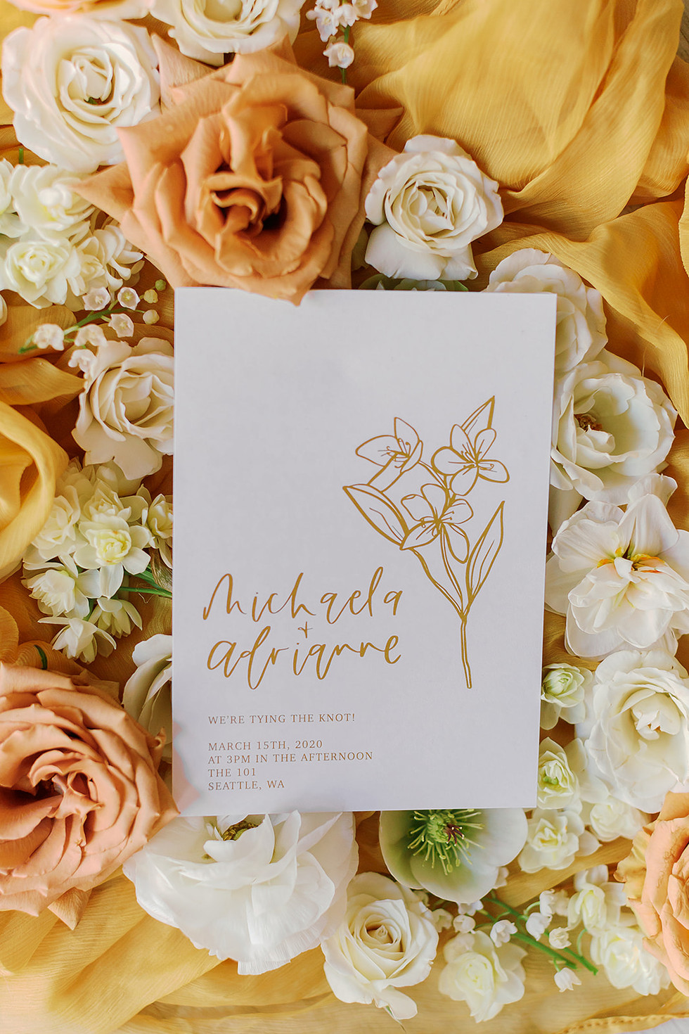 Photography: Sarah Harris Photography | Design & Planning: Willow & Ivy Events | Florals: Leah Erickson Floral | Venue: The 101 | Linens: Party Crush Studio | Tabletop Rentals: CORT Party Rental | Paper Goods & Calligraphy: W Design Shop | Furniture: Yay Parties | Makeup: Bethany Yackel Beauty | Hair: Tousled and Lovely | Jewelry: Anueva Jewelry | Dress: A and Be Seattle | Jumpsuit & Jacket: Nyanza Bridal | Models: Michaela and Adrianne