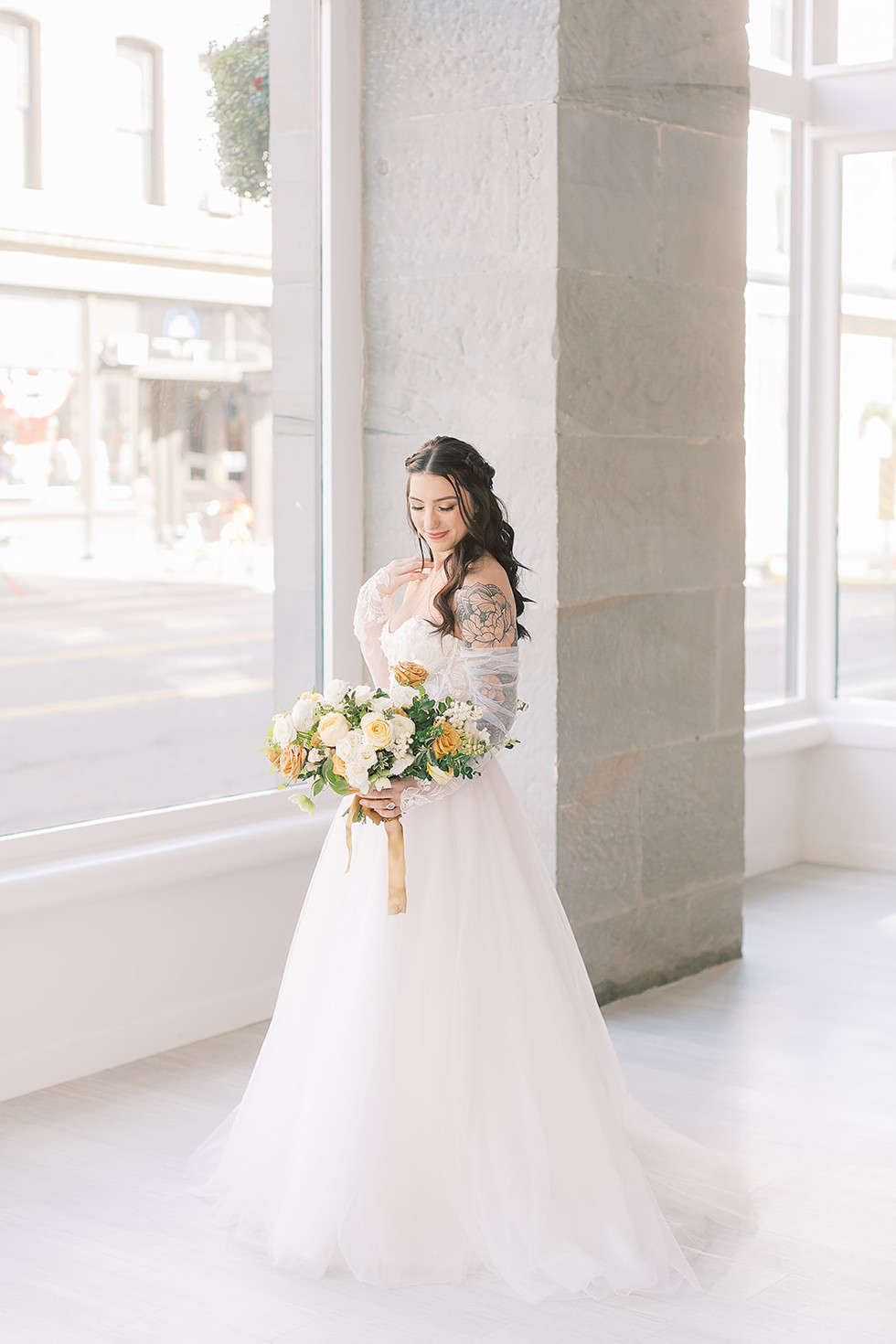 For Michaela's attire we went for a soft, feminine approach. The flowy gown featured detachable sleeves with delicate lace - a trend we see becoming big in 2020! - that really highlighted her tattoo sleeve. For Adrianne we went a little more rock n roll with a deep v cut jumpsuit and white jacket. Adrianne's messy pony showing off her undercut was also curated to be a little more edgy when compared to Michaela's flowy ethereal curls, both by Tousled and Lovely. Both had soft, subtle makeup by Bethany Yackel Beauty that allowed for their natural beauty to be the star. And don't miss out on those rings! Anueva Jewelry created some stunning, unique bling for both ladies featuring diamonds and colored gems.