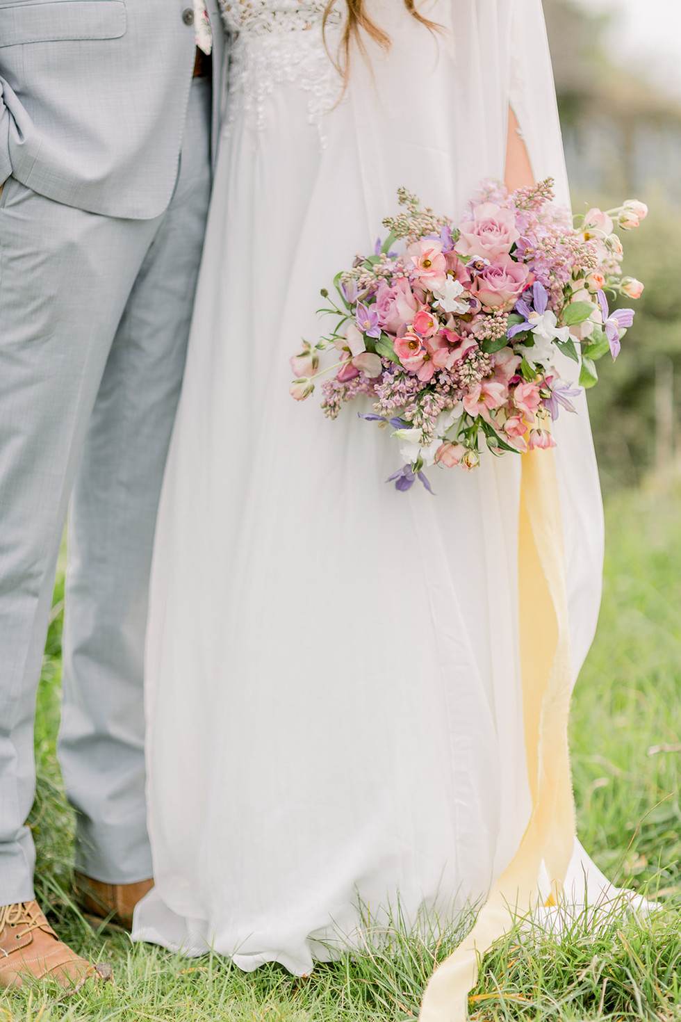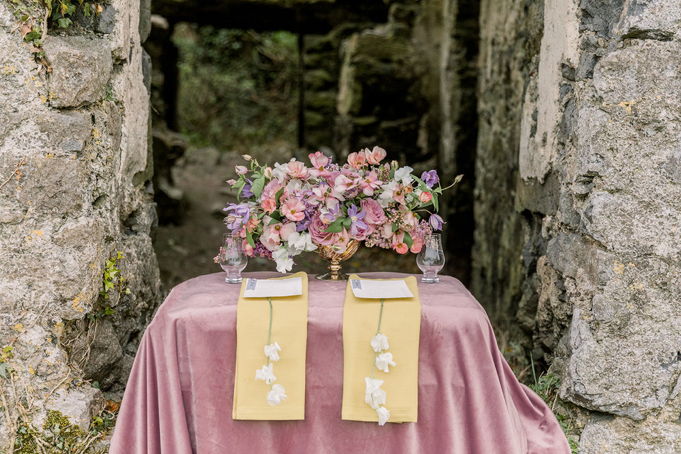 This styled shoot set in Galway Ireland was first and foremost inspired by the castle ruins of Menlo Castle. The hard, rough edges of the stone walls are softened by the lush greenery and ivy crawling up them. We wanted to play off of that with super soft and fluffy florals in varying shades of dusty lilac and lavender. The bouquet and centerpiece from Petal + Vine were made up of the lightest flowers imaginable; sweet pea, butterfly ranunculus, lilacs, clematis, and roses, which gave these details an airy feel, reminiscent of a fairy tale.